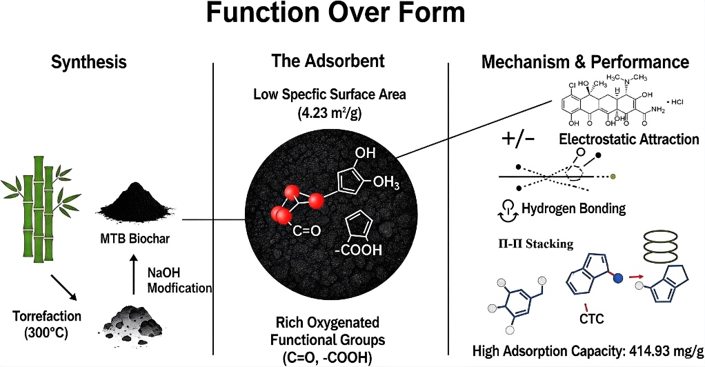 传统净水材料往往依赖复杂的多孔结构和高温处理,成本高、能耗大。该团队另辟蹊径,提出“功能比结构更重要”的新思路:该研究先将竹子在较低温度下烘焙,形成稳定的碳骨架;再用温和的碱液表面进行“修饰”,通过精准“安装”能抓住抗生素分子的化学基团,最终得到看起来“孔很少”(比表面积仅4.23 m²/g),却对常见抗生素盐酸金霉素表现出极强的吸附能力的生物炭,吸附效率甚至超过了石墨烯等高端材料。