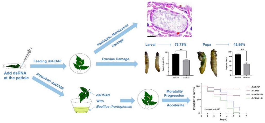 本研究在番茄潜叶蛾中鉴定出几丁质脱乙酰酶8(CDA8)基因,揭示其具有调控幼虫发育与维持围食膜完整性的双重功能,突破了以往对该基因功能的单一认知。通过RNAi沉默该基因不仅导致幼虫蜕皮障碍和死亡,并破坏围食膜结构;与苏云金芽孢杆菌(Bt)联用可协同加速害虫死亡,第六天死亡率达100%。该研究阐明了CDA8同时参与表皮和围食膜几丁质代谢的双重机制,证实RNAi靶向该基因可通过破坏围食膜屏障显著提升Bt侵染速度,实现“内外协同”的增效作用,为“RNAi-Bt”害虫绿色防控策略提供了新的靶标基因和技术路径。