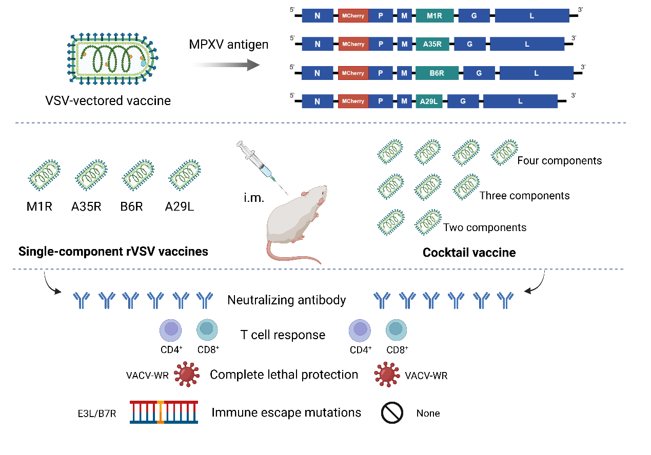 近日,中国农业科学院兰州兽医研究所畜禽重要人兽共患病团队成功构建了一种新型“鸡尾酒式”多抗原疫苗。该疫苗采用水疱性口炎病毒载体,同时搭载四种猴痘病毒关键抗原,对致死剂量病毒攻击实现完全防护。