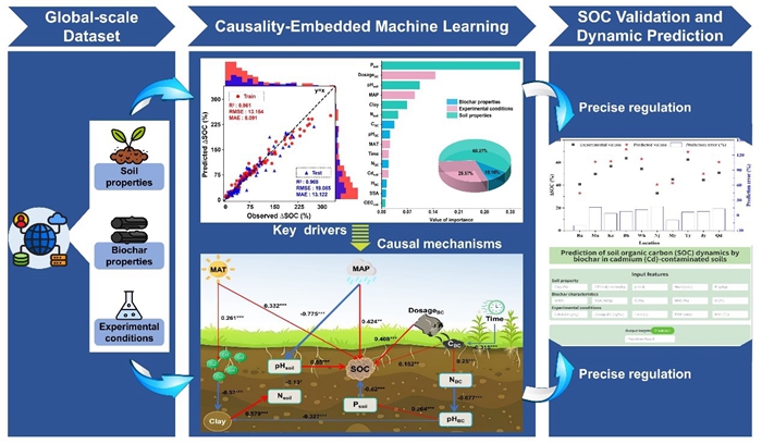 近日,农业农村部环境保护科研监测所产地环境监测与预警创新团队利用机器学习与因果路径模型,阐明了生物炭驱动镉污染土壤有机碳变化的内在规律,为实现镉污染土壤固碳精准化提供了理论依据。相关研究成果发表在《环境科学与技术(Environmental Science & Technology)》上。