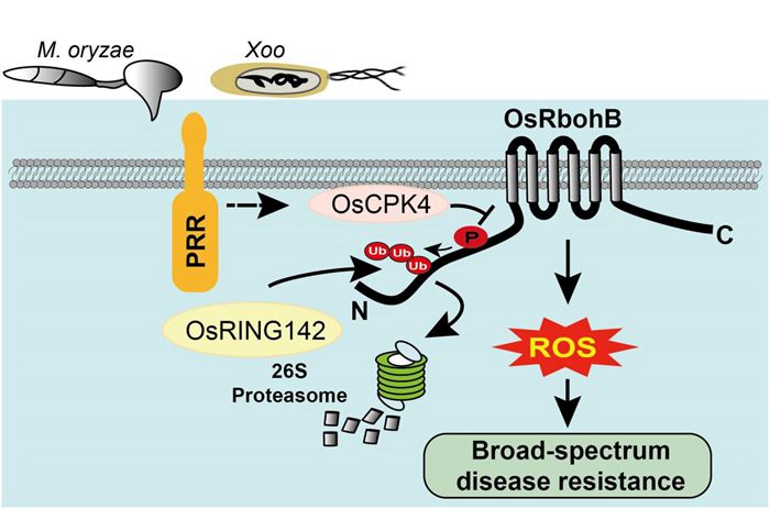 该研究发现,在水稻中过量表达呼吸爆发氧化酶基因OsRbohB可增强对稻瘟病菌和白叶枯病菌的抗性。该酶可同时与钙依赖蛋白激酶和泛素连接酶相互作用,其磷酸化修饰促进泛素化降解从而调控其稳态。进一步研究鉴定了该酶的关键磷酸化和泛素化位点,证实这些位点的功能缺失突变显著增强水稻的抗病性。该成果为植物免疫稳态调控提供了新视角,为水稻抗病遗传改良提供了新材料。