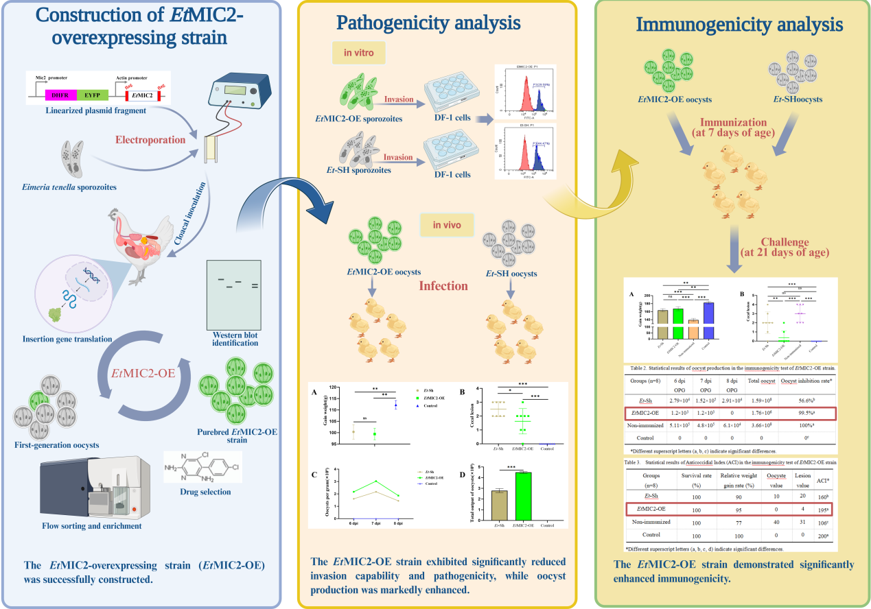 该研究通过基因编辑技术,成功构建了稳定过表达微线体蛋白的转基因球虫株。与亲本株相比,该虫株在致病性显著降低的同时,繁殖能力提升61.0%。免疫攻毒试验证实其具有优异的免疫保护效果。该研究揭示了微线体蛋白调控球虫的多种表型,证实了通过精准调控关键蛋白表达可实现球虫“减毒不减产”,获得兼具低致病性、高免疫原性与良好繁殖性能的候选疫苗株。该研究成果不仅为开发新型球虫病疫苗提供了可靠的技术路径,其建立的基因编辑与表型评估体系也为其他顶复门原虫研究提供了新思路。