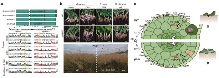 科研人员通过近10年科研攻关,在十字花科作物中鉴定出关键保守感根肿病基因GSL5,该基因被根肿菌劫持和利用进而关闭茉莉酸抗病通路,促使根肿菌致病,通过敲除GSL5,植物能够响应根肿菌侵染重启茉莉酸抗病通路,从而创制出了广谱高抗根肿病的油菜、白菜和甘蓝突破性新种质,且在田间条件下对油菜生长发育和产量无影响,为十字花科作物根肿病抗性改良与高效持久防控提供了关键基因、种质和技术手段。
