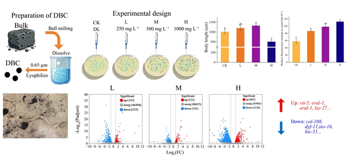 该研究以模式生物秀丽隐杆线虫为对象,系统揭示了溶解性生物炭的生态效应与分子机制。研究表明,溶解性生物炭对线虫呈现剂量依赖性双重效应,即在低浓度(每升250–500毫克)条件下,线虫生长和运动得到促进;在高浓度(每升1000 毫克)条件下,线虫发育受到抑制并诱导氧化应激。溶解性生物炭处理剂量的增加导致线虫差异表达基因数量显著增多。该研究从新视角揭示了溶解性生物炭对土壤线虫的生理与分子作用规律,为科学评估生物炭应用的环境风险、优化土壤健康提供了理论参考。