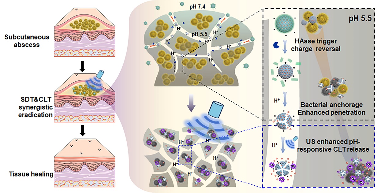 针对耐甲氧西林金黄色葡萄球菌(MRSA)易形成生物被膜从而产生耐药性、持续性和反复性感染的现状,本研究构建了一种透明质酸酶(HAase)与pH双重响应、具备电荷反转特性的纳米制剂(HA@PCN-CLT),用于高效递送天然植物活性成分雷公藤红素(CLT)。该制剂在生理条件下保持稳定,而在含有HAase、pH为5.5的生物被膜微环境中,可发生电荷反转,实现深层渗透并酶解释放CLT。在超声波激活下,材料能产生大量活性氧(ROS),与CLT的药理活性协同作用,从而高效清除MRSA生物被膜。动物实验表明,HA@PCN-CLT在超声作用下不仅完全消除小鼠的细菌感染,还可通过促进血管生成和胶原沉积加速组织愈合,同时表现出优异的生物相容性和可忽略的毒性。该研究不仅首次实现了CLT针对耐药菌及其生物被膜的有效递送,更揭示了其与声动力疗法的协同抗菌机制,为高效治疗耐药菌及其生物被膜提供了一种创新的无抗生素策略。