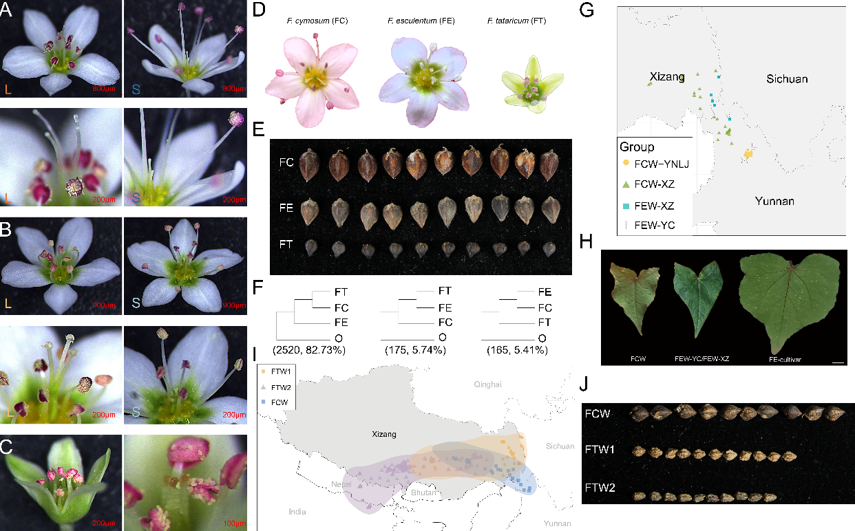 研究团队通过对喜马拉雅山区的野生甜荞、野生苦荞及西藏野生金荞种质资源的系统调查、形态比较和基因组分析,明确了金荞与苦荞的亲缘关系最近,而甜荞则作为一个姊妹支平行进化的分化关系,是由花期和育性等性状的差异导致。同时,通过群体遗传学对表型相似性分析发现,野生甜荞与金荞的表型相似是由于高海拔环境的趋同适应,野生苦荞与金荞的相似则源于历史上的基因渗入。该研究阐明了作物与其野生近缘种的遗传关系,为丰富作物种质资源学基础理论提供了新的见解。