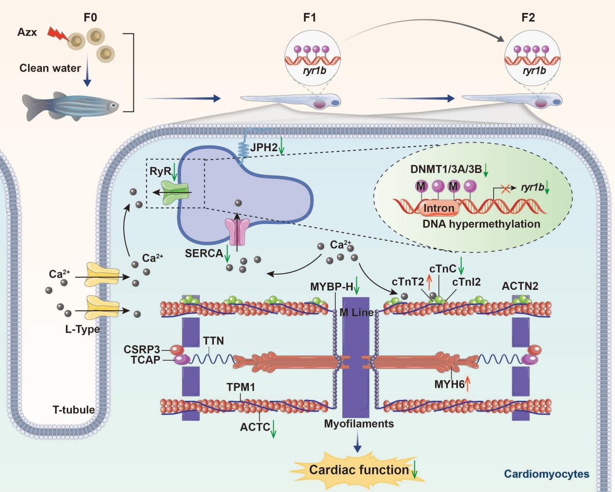 本研究发现,低于斑马鱼胚胎毒性阈值的嘧菌酯暴露(1、10、100 μg/L,暴露时长 4 天),未在 F0 代胚胎中引起可观察毒性效应,却导致未暴露的 F1、F2 代胚胎/仔鱼出现畸形率增加、心跳次数减少及体长抑制等发育异常效应,且该效应与亲本性别无关,证实嘧菌酯亚阈值暴露具有跨代发育毒性。同时,F1、F2 代胚胎中 DNA 甲基转移酶蛋白水平降低,基因组 DNA 甲基化模式发生改变。进一步研究表明,ryr1b基因在 F1、F2 代中呈现基因表达抑制与 DNA 高甲基化的同步特征,且两代中 ryr1b 的甲基化修饰位点几乎一致,表明 ryr1b 的 DNA 高甲基化可稳定跨代遗传,并通过表观遗传调控基因表达。通过构建两代差异表达基因的相互作用网络,发现 ryr1b 基因在基因网络中占据核心位置,并通过钙信号通路触发连锁反应,调控心肌细胞中兴奋-收缩耦合(ECC)相关基因表达,最终导致子代胚胎出现心脏功能缺陷与发育异常。本研究为农药的风险评估提供了新的科学视角,揭示了低于阈值的农药暴露可通过引发可遗传的表观遗传变化,进而在水生生物中诱发代际发育毒性。本研究阐明的表观遗传变化机制,为水生生态系统中农药风险评估提供了新的生物标志物,也为建立更精准的生态风险评估体系提供了科学依据。