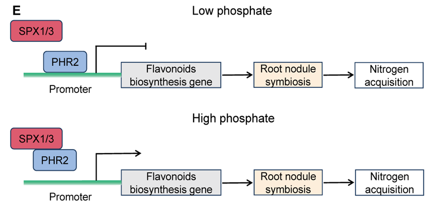 研究发现了苜蓿的SPX1/3-PHR2磷平衡调控网络,该网络能够根据磷浓度高低调控类黄酮合成来控制根瘤共生水平,从而平衡根瘤菌介导的氮吸收量。当磷充足时,SPX1/3与PHR2相互作用解除对类黄酮合成基因的抑制,促进类黄酮分泌以吸引根瘤菌等固氮微生物,增强根瘤共生固氮;而磷缺乏时,PHR2抑制类黄酮合成,减少固氮微生物招募。这一发现为理解植物通过调控根际微生物来平衡氮磷吸收提供了新视角,对优化植物营养获取策略有重要意义。