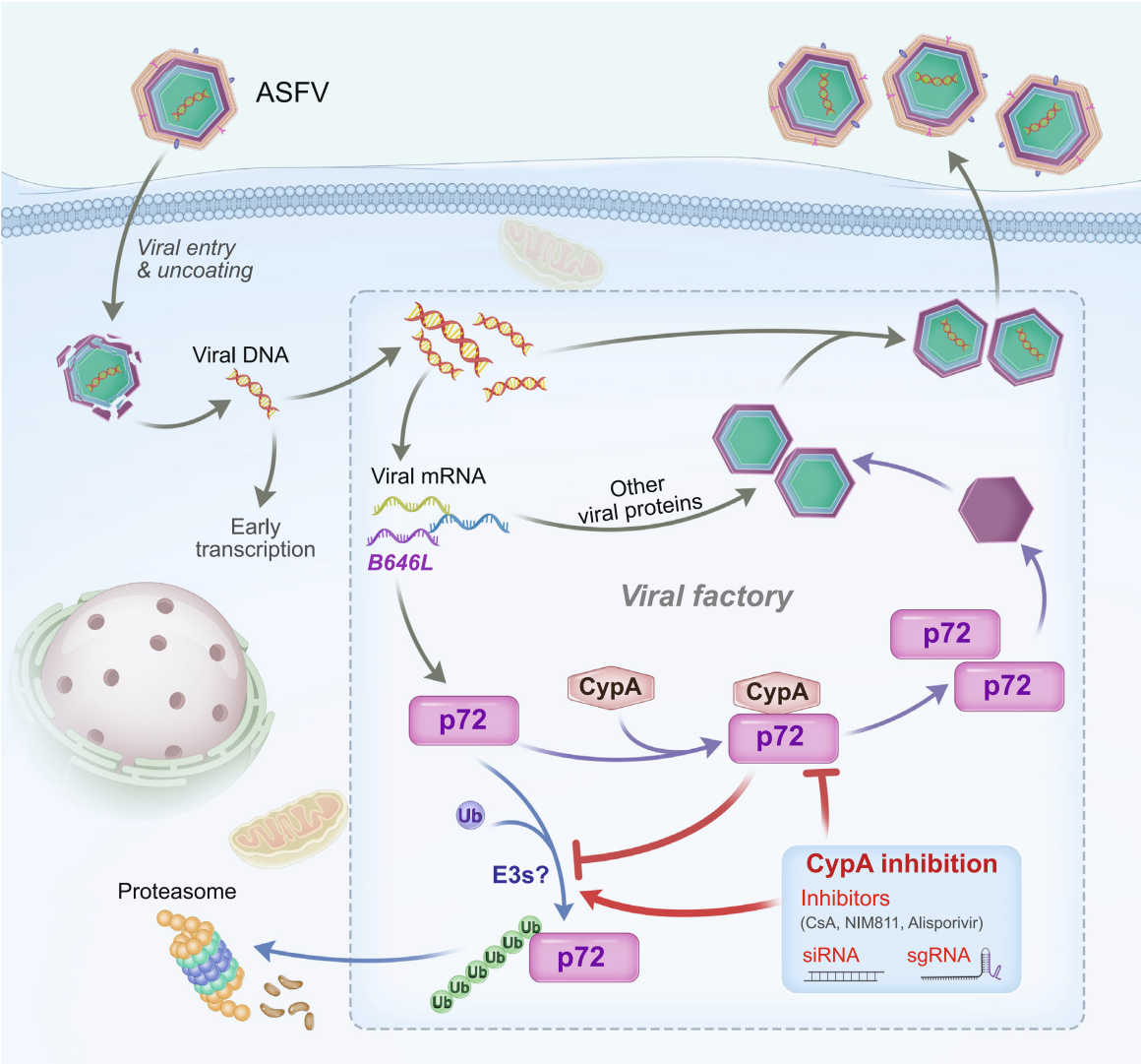 研究发现,宿主的亲环蛋白A是病毒复制的“帮凶”,它能够特异识别并结合p72,阻止宿主泛素化途径降解p72蛋白,从而使其在细胞内更加稳定。反之,当亲环蛋白A受到抑制时,p72蛋白在细胞内的积累就会大大减少,从而破坏了细胞内“病毒工厂”的形成和子代病毒颗粒的组装,进而抑制病毒的复制。该研究拓展了对非洲猪瘟病毒复制调控的认知边界,为精准制定防控策略和抗病育种工作奠定了重要理论基础。