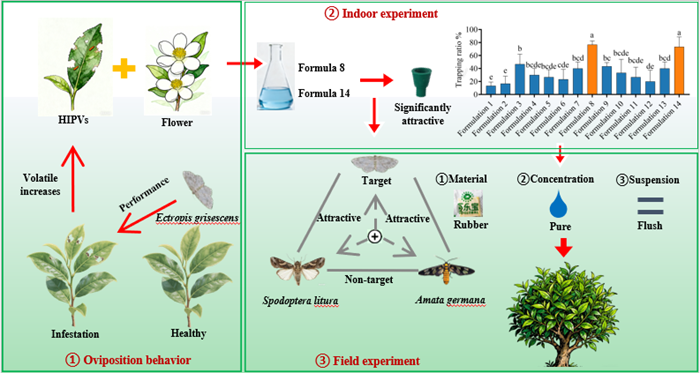 挥发物是植物的“语言”。尽管已知茶树挥发物在灰茶尺蠖寄主识别中扮演核心角色,但如何将这些信号有效整合,开发出高效、稳定的引诱剂,特别是探索虫害诱导挥发物与花香气味是否存在协同增效作用,此前尚无系统研究。
