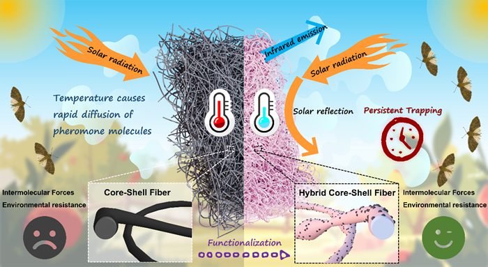 近日,中国农业科学院植物保护研究所农药分子靶标与绿色农药创制创新团队开发出一种纳米纤维薄膜,兼具温度调节和缓释功能,可有效延长昆虫性信息素在高温下的有效期。相关研究成果发表在《先进功能材料(Advanced Functional Materials)》上。