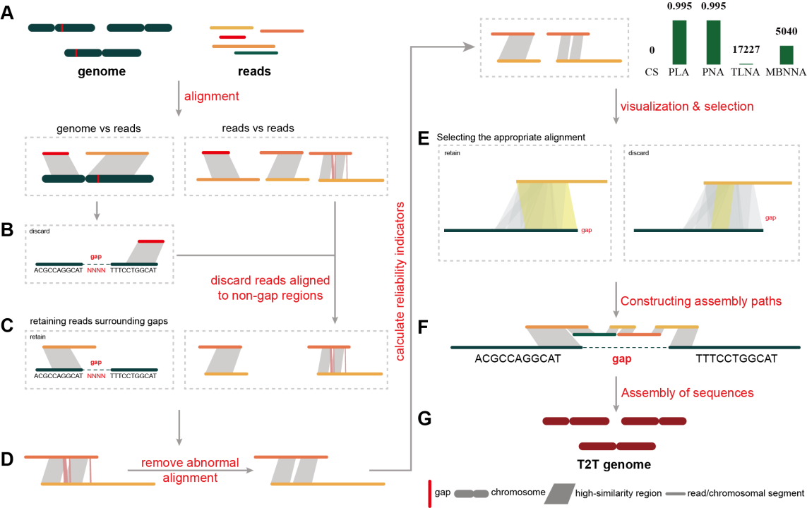 大幅提升补洞效率:通过系列技术创新优化时空效率,例如 Gap-Aid 将重复比对任务转化为 “一次性读长比对”,避免迭代计算耗时;Gap-Graph 开发染色体 - 组装图优化对齐算法,解决传统工具难以对齐全染色体的问题。相比传统手动补洞需数周,该工具可将同类任务缩短至数天,且支持 “中途保存、回溯纠错”,适配大缺口补洞需求。