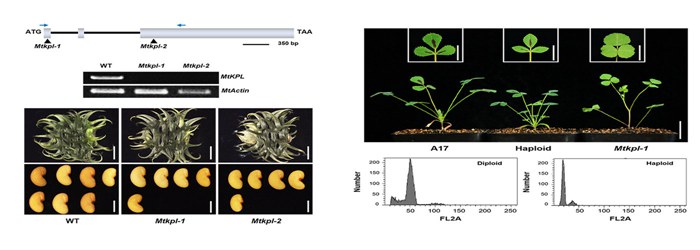 已有研究发现KPL同源基因在植物界具有高度保守性,且表现出单倍体诱导能力。该研究在蒺藜苜蓿中鉴定出它的同源基因,并获得了其功能缺失突变体。研究发现,突变体的自交后代及作为父本的异交后代中均有单倍体植株产生,首次证实该基因缺失能够有效触发苜蓿体内母本单倍体的产生。研究结果为豆科植物单倍体育种提供了新靶标与重要基础。
