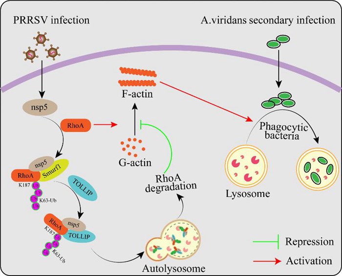细菌入侵后,本应被巨噬细胞的溶酶体“消化”清除,但是研究却发现,蓝耳病病毒拆除了巨噬细胞内的“运输轨道”,也就是细胞骨架——肌动蛋白丝。失去轨道指引的溶酶体无法及时运输到细菌所在位置,细菌因此逃避了“清除”,并在细胞内存活。该研究揭示了病毒帮助细菌存活的新机制,为研发抗病新药物提供了新思路。