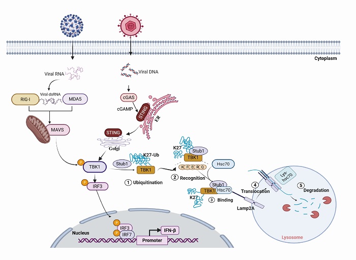 研究发现,Stub1作为一种特殊的调控分子,能够精准识别干扰素的启动信号,并为“指挥官”TBK1贴上特殊的“销毁标签”,再由“搬运工”将其送入溶酶体降解。这一过程有效减少干扰素的产生,使免疫反应适时“刹车”。研究展现了宿主在抗病毒免疫中“攻守兼备”的精细平衡,也为干预过度免疫反应提供了新思路。